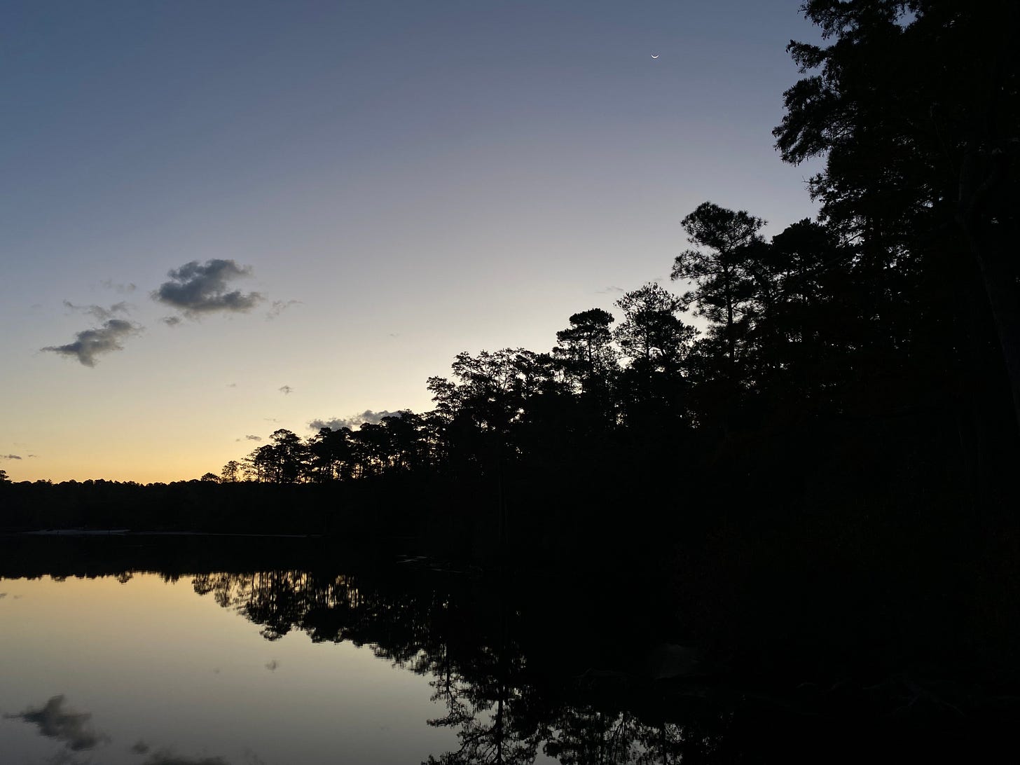 My partner, Kim, and I recently discovered the ineffable beauty of Jones Lake State Park. Her parents came down from Indiana to visit her brother who lives near Wilmington, so we drove up to meet them for an overnight stay via the Blue Ridge Parkway and Winston-Salem. It’s worth a stop, in particular if you’re heading to the North Carolina coast. You’ll be rewarded with an open sky and fragrant pines, soft ground and mirror lake at dawn.—BK