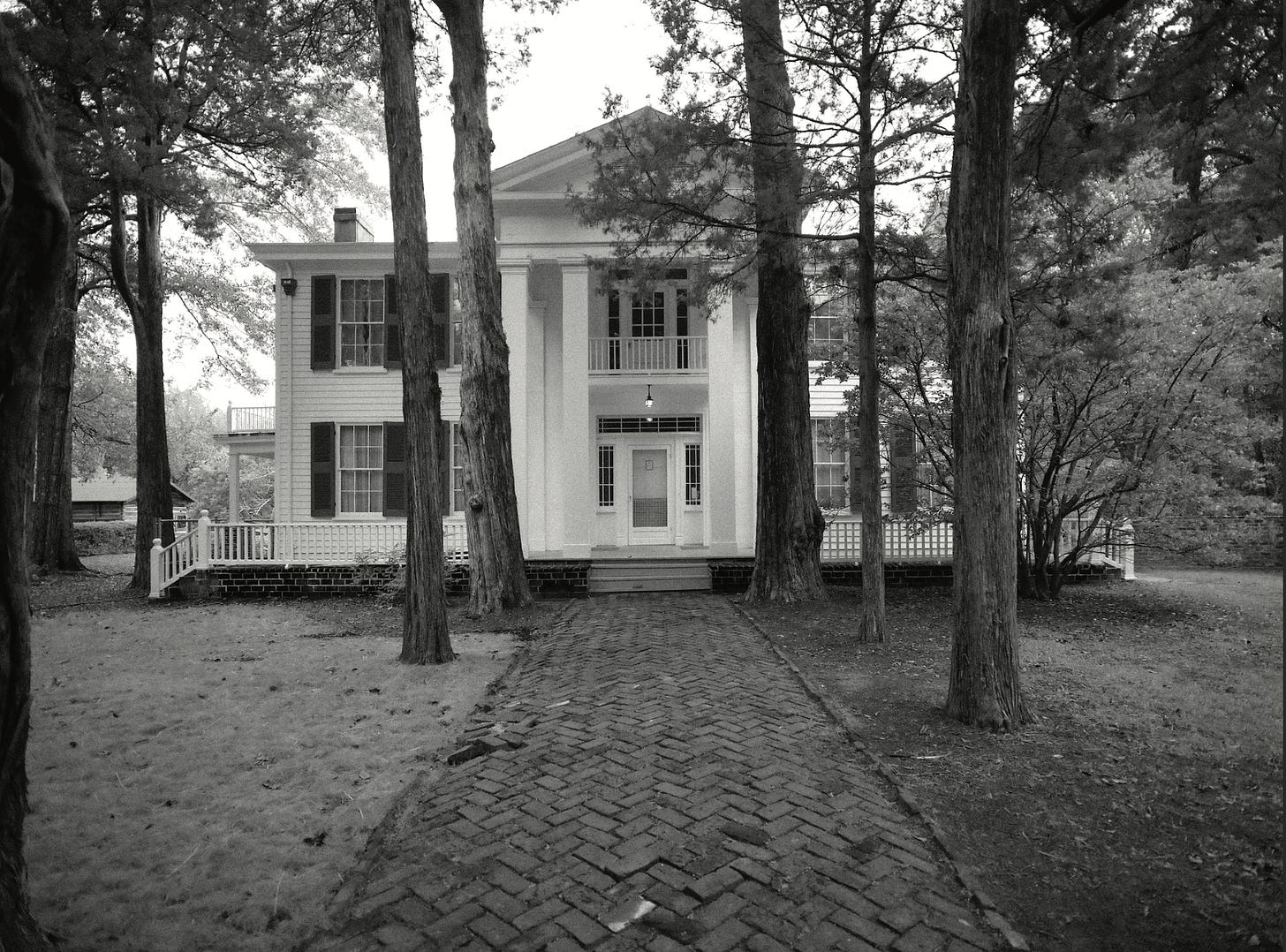 An antebellum outbuilding was used by the house’s former owners, the Sheegogs, as a dwelling for enslaved people and was later converted into an outdoor kitchen, and later still converted by Faulkner into a smokehouse for storing and smoking ham. These outbuildings and gardens are wrapped by twenty-nine acres of hardwood forest, accessible by a well-maintained trail. Magnificent eastern red cedar trees line the walkway from the road to the house, cedars planted after yellow fever swept through the South because such trees were believed to purify the air.